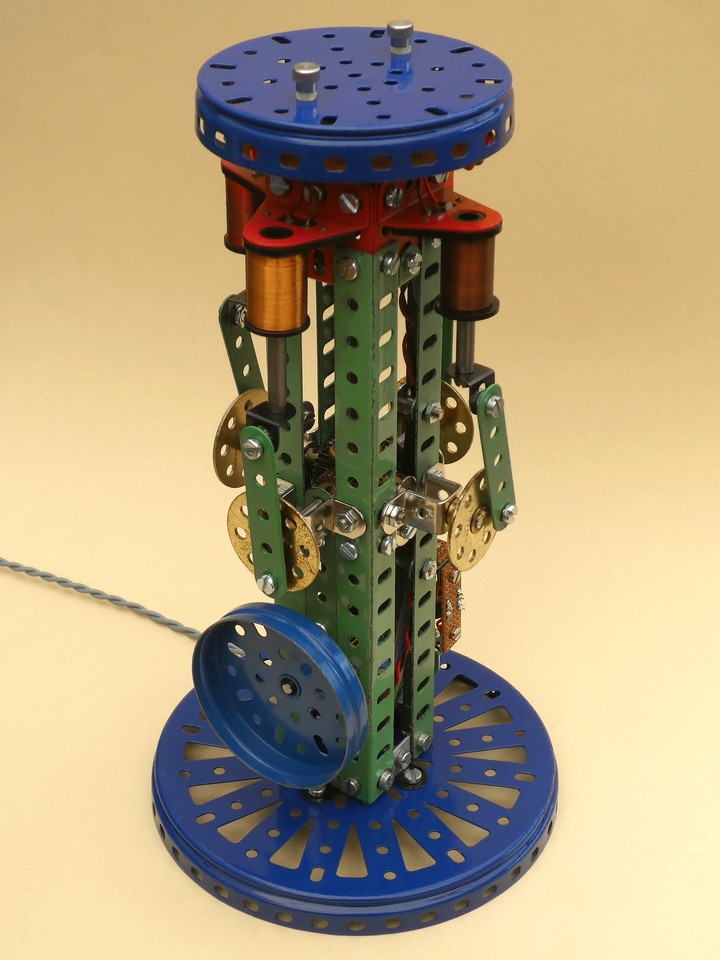 Mittels 5 Loch langer Pleuelstangen und Exzenter aus Lochscheiben werden die unter den Spulen liegenden