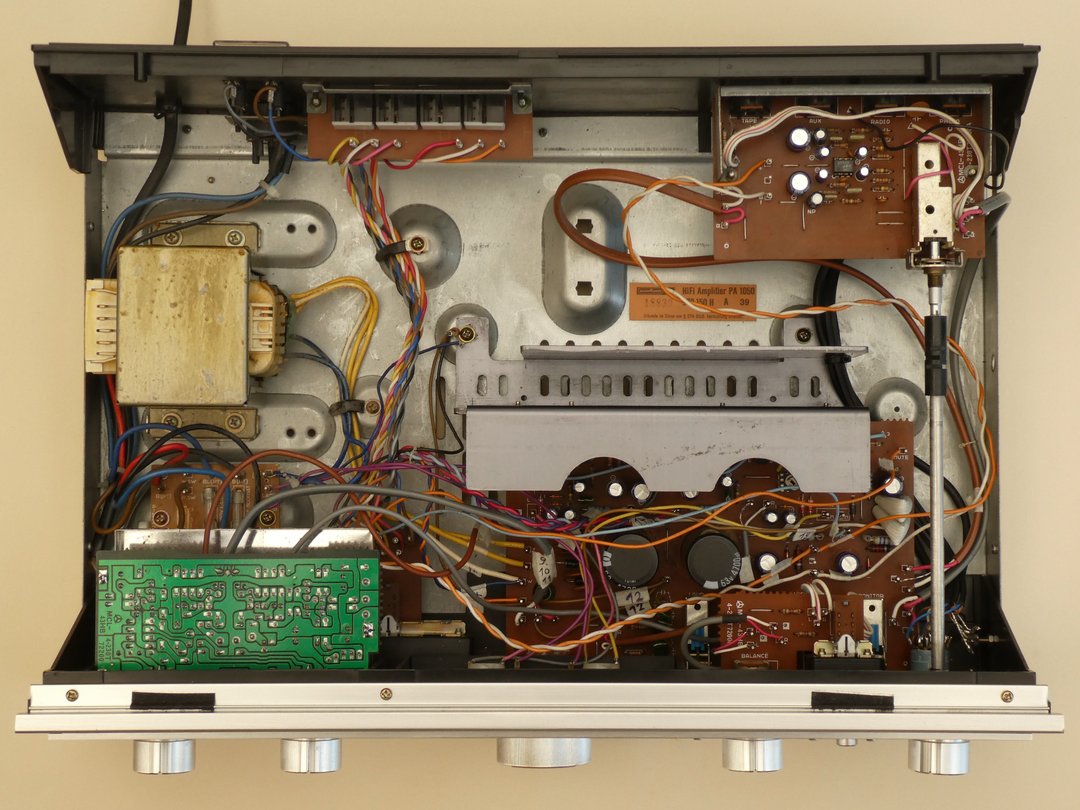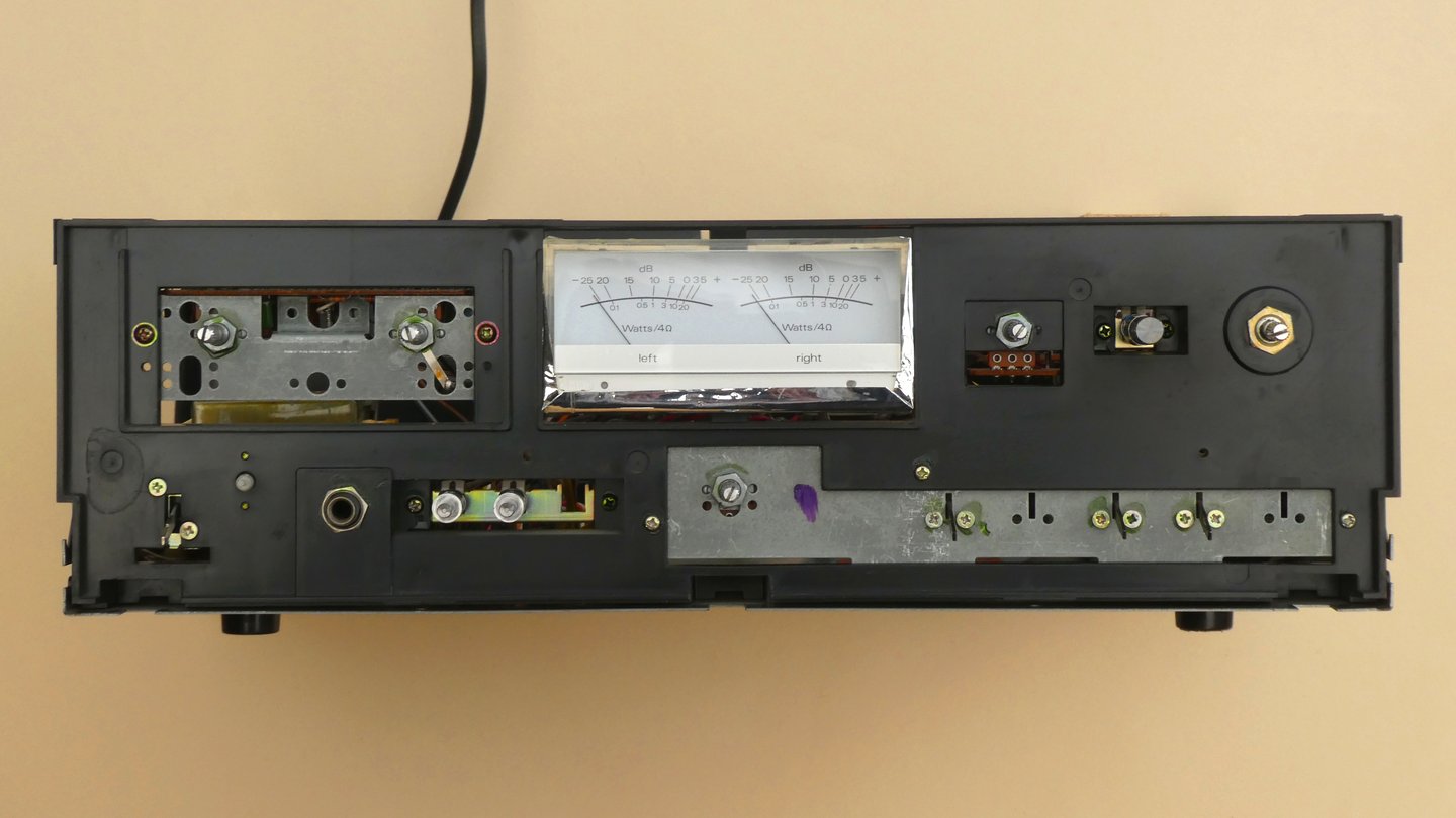 Leider zeigte das Lautstärke-Potentiometer nach jahrzehntelanger Benutzung zunehmend Symptome von Verschmutzung oder Verschleiß in Form von Kratzen bis hin zu kompletten Aussetzern im Bereich der üblicherweise eingestellten Zimmerlautstärke. Für eine weitere Nutzung des Verstärkers war also zumindest eine Reinigung oder ggfs. der Austausch des besagten Potentiometers erforderlich und bei dieser Gelegenheit bot sich nach 45 Jahren auch gleich der Ersatz sämtlicher Elektrolyt-Kondensatoren an. Im Laufe der Zeit hatten sich aber auch die Ansprüche an einen solchen Verstärker geändert. Plattenspieler und Tonbandgeräte sind heutzutage nicht mehr sehr gefragt, dafür war die Nachrüstung weiterer Eingänge für PC, CD und TV wünschenswert, ohne ständig umstöpseln zu müssen. Im November 2025 wurde der NORDMENDE PA 1050 deshalb umfangreich überarbeitet. Zum Öffnen des Verstärkers sind auf jeder Seite 2 Schrauben zu entfernen und danach kann die Haube vorsichtig nach oben und hinten abgenommen werden. Die kleine Schraube oben in der Mitte der Rückwand sollte nicht entfernt werden, da sie lediglich einen Winkel zur Stabilisierung der Rückwand fixiert.