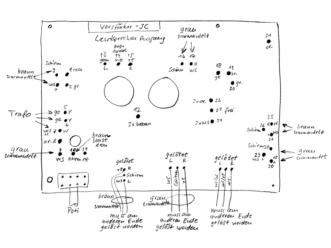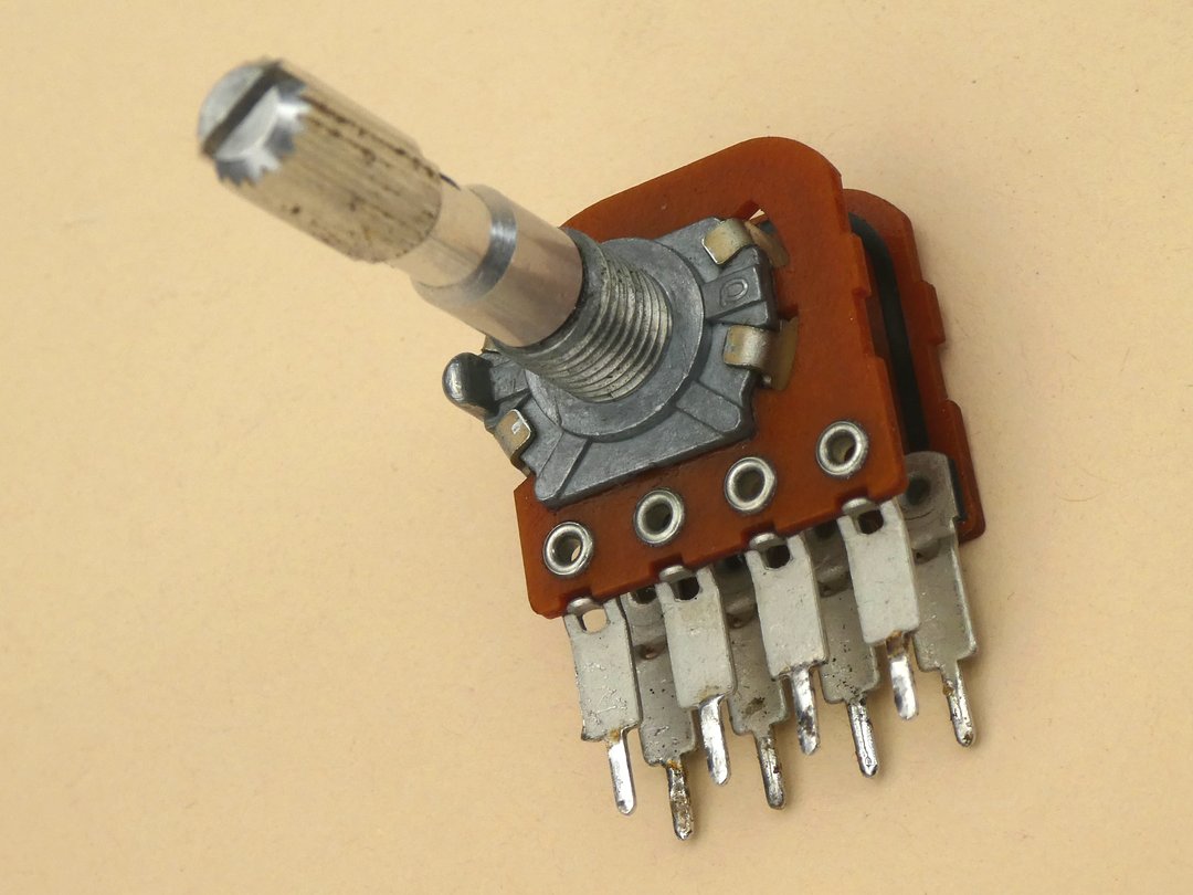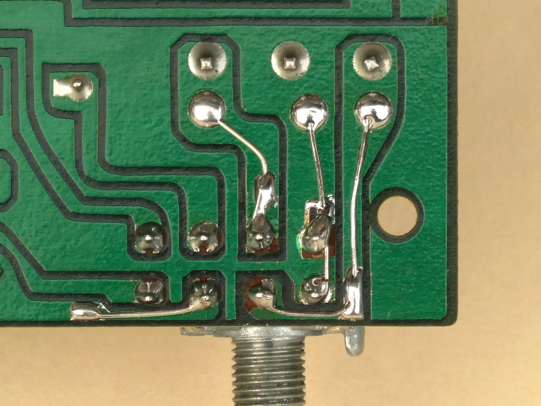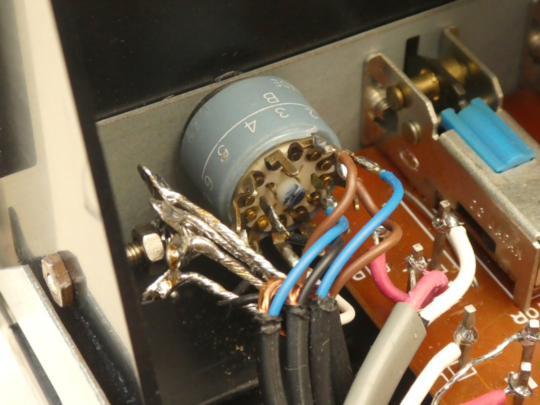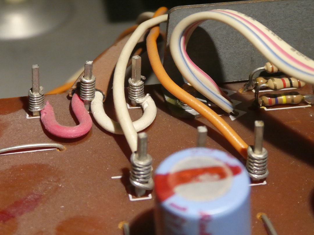 Es liegt auf der Hand, dass ein solch spezielles Potentiometer heutzutage praktisch nicht mehr zu beschaffen ist und deshalb war zunächst zu untersuchen, ob das alte Poti evtl. noch gerettet werden kann. Die Alternative wäre ein herkömmliches Stereo-Poti 2 x 100k log und der Verzicht auf die loudness-Funktion. Dazu wurde das Poti ausgelötet, was angesichts der 8 Pins ohne ein brauchbares Entlöt-Gerät ein "unfallträchtiges" Unterfangen ist - soll heißen: es besteht die Gefahr des Ablösens von Lötaugen und/oder Leiterbahnen. Wenn das passieren sollte, dann kann man - wie im vorliegenden Fall - ein fehlendes oder beschädigtes Lötauge mit einer Drahtöse nachbilden und das andere Ende des Drahtes an der noch intakten Leiterbahn anlöten (siehe übernächstes Bild). Für beide Widerstandsbahnen wurde ein Wert von ca. 82kΩ und zwischen Masse-Pin und Loudness-Abgriff ein Wert von ca. 38kΩ gemessen - also etwa die Hälfte. Anschließend wurde das Poti mit einer geringen Spannung beaufschlagt und die Ausgangsspannung am Schleifer mit einem Oszilloskop dargestellt. Beim Drehen der Achse zeigten sich deutlich die Fehlstellen in der Kontaktgabe in Form von Spikes auf der Ausgangsspannung. In diversen Internet-Foren wird berichtet, dass Potis nicht mit aggressivem Kontaktspray gereinigt werden sollten, sondern mit dem Sprühöl Ballistol gewisse Erfolge erzielt wurden - das war auch hier zumindest einen Versuch wert. Nach der Reinigung des Potis mit Ballistol wurde die Ausgangsspannung am Schleifer erneut geprüft mit dem Ergebnis, dass die Spikes beim Drehen der Poti-Achse verschwunden waren. Es bestand also die berechtigte Hoffnung, dass das Poti noch brauchbar sein könnte. Als Nächstes wurde der Vorverstärker mit Klangeinsteller bearbeitet. Er ist leicht demontierbar und die Wickelverbindungen müssen auf dieser Leiterplatte nicht gelöst werden. Alle Leitungen führen zur Leistungsverstärker-Platine und zu deren Ausbau waren sie dort sowieso abzuwickeln. Um die insgesamt 12 Elektrolyt-Kondensatoren austauschen zu können, ist das mit 3 Lötstellen befestigte Abschirmblech zu entfernen.