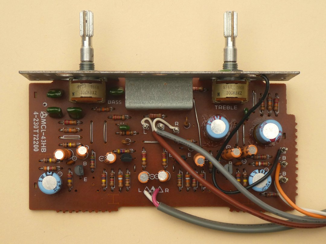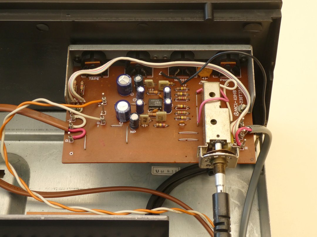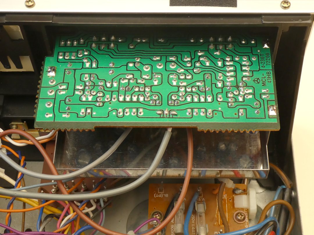 Nach Entfernung von 6 Schrauben im Bereich der 3 Schalter und der Befestigungsmutter für das Lautstärke-Poti sowie weiterer 2 Schrauben im Bereich des Kühlkörpers kann die komplette Baugruppe herausgenommen werden. Zum Austausch der 20 Kondensatoren ist es ratsam, auch den Verstärker-Schaltkreis vom Kühlkörper zu lösen und den Kühlkörper abzuschrauben.